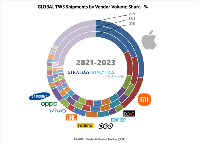 可以说,是苹果耳机带飞了歌尔股份。然而好景不长,随着其他厂商进入,AirPods的市场占比不断缩减,Strategy Analytics报告预计,AirPods2022年的市场占比或将首次低于20%,最终维持在20%的水准线上。