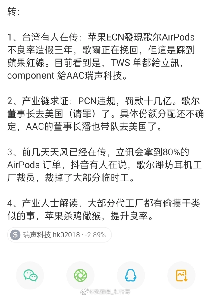 事实上,关于歌尔股份代工苹果耳机出现质量问题停产的消息,在8日公告之前已在抖音等网络平台上有所发酵。