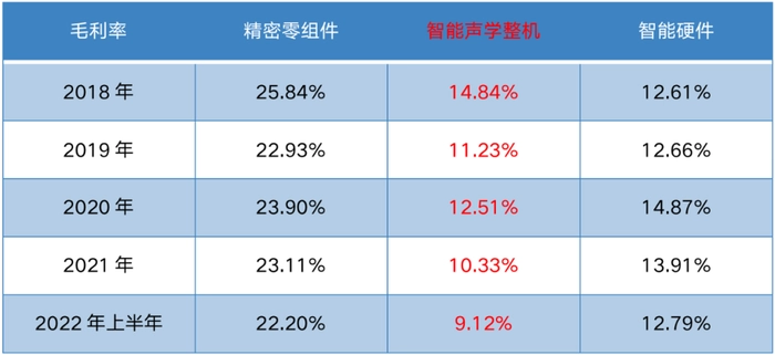 从歌尔股份的财报中也可以看到,苹果一直在压缩供应商的利润空间。刚拿下苹果耳机业务的2018年,智能声学整机业务毛利率还处在较高的14.84%,但之后却变成了最低的,并且呈下降趋势。2022年上半年,智能声学整机业务毛利率已降至10%以下。