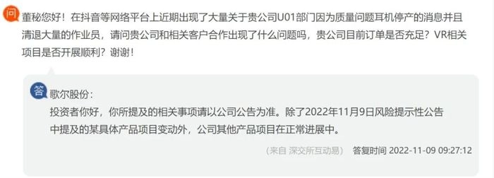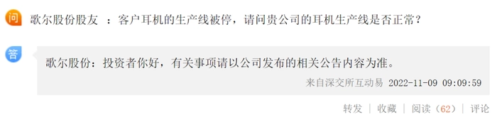 各类传闻甚嚣尘上,这一切还得看歌尔股份是否会有所回应。不过,在股友询问“耳机生产线是否正常”时,歌尔股份并没有给予正面回答。