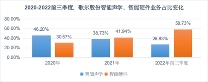 而智能硬件业务也在2021年成功超过智能声学整机业务,成为贡献最多的支柱业务。2022年前三季度,歌尔股份智能硬件业的总营收比重已经增长至58.7%,是当之无愧的增长引擎。