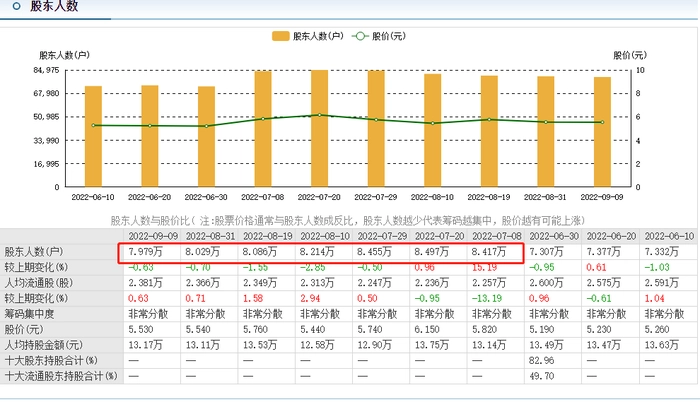 高层频频变动,带来的直接后果是股东的不信任,在股东人数上,国网英大的股东人数降至近2个月最低,2022年7月8日股东人数为8.417万人,而9月9日的股东人数为7.979万人,股东人数减少4380人。较8月31日减少504人,股东人数低于行业平均水平。根据Choice数据,截至2022年9月9日非银金融行业上市公司平均股东户数为13.67万户,国网英大低于平均数近6万人。户均持有流通股份2.38万股,户均流通市值13.17万元,这一数值第一行业平均值为33.27万,28.57%的公司户均持有流通股市值在15万~27万区间内,而国网英大的户均流通值明显偏低。
