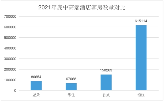 行业龙头华住集团2021年将旗下酒店分为经济型、中档、中高档和高档四类,仅中高档一类而言,同期客房数为67068间,确实比亚朵少一些,但若是将中档酒店也纳入进来,合计客房数量则达338489间,远超亚朵。