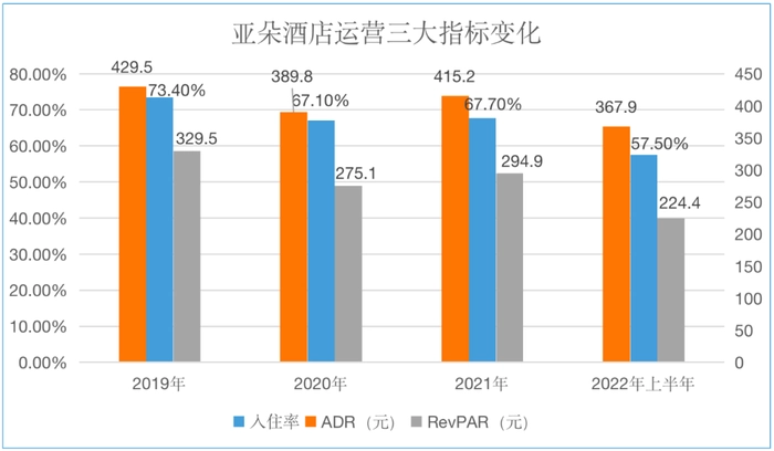 再来看衡量酒店运营最重要的三大核心指标——入住率、日平均房价(ADR)和平均客房收入(RevPAR),亚朵的表现也不如人意。