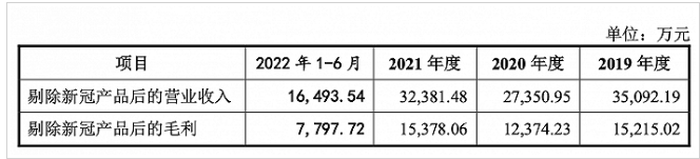 再以中翰生物为例,2021年中翰生物总营收为11.57亿元,同比增长284.38%,净利润高达2.66亿元,同比暴增1230%。净利润增幅远大于营收增幅,净利润增幅为营收增幅4.33倍,成为业界关注的焦点。细分其营收可以发现,其新冠检测业务贡献了8.33亿元,占比高达72%,如果剔除新冠业务后,2019年-2021年整体毛利额竟然出现了较大的波动,甚至在2020年还出现了较大下滑,下滑幅度高达19%。