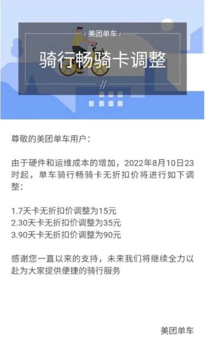 2022年8月美团宣布涨价,这次涨价一度登上微博热搜。涨价后,美团单车7天、30天、90天无折扣骑行卡价格分别由10元、25元和60元涨价至15元、35元和90元。涨幅分别为5%、40%和 50%,美团单车解释称本次涨价原因是“硬件和运维成本增加”。