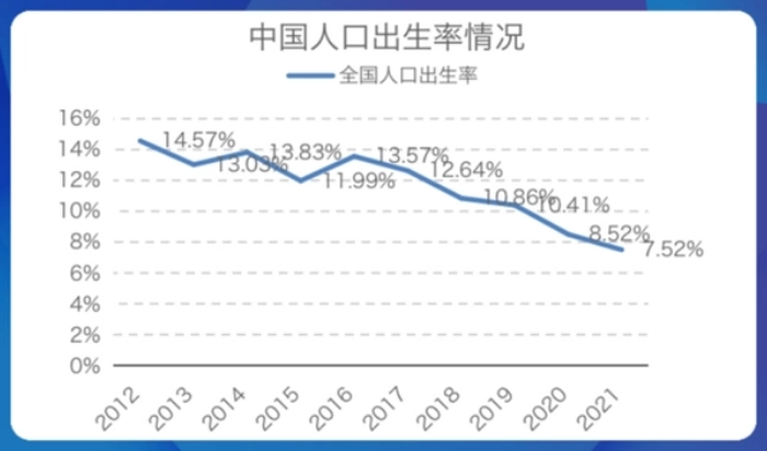 2016年中国放开二胎后,当年我国的新生儿数量是1846万,创下了一波小高峰,但新生儿数量很快便下降,到了2020年,我国新生儿人口数量仅仅只有1200万,2021年出生人口创下了建国后的新低,只有1062万人,新生儿数量在五年内降低了42.3%。出生率也由2012年的14.57%下降至2021年的7.52%。