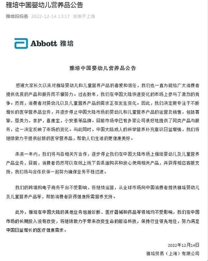12月14日午后,知名母婴品牌雅培宣布,将逐步停止中国大陆市场的婴幼儿和儿童营养品的运营和销售,仅保留跨境渠道。停止运营和销售,或意味着雅培官宣败走中国。
