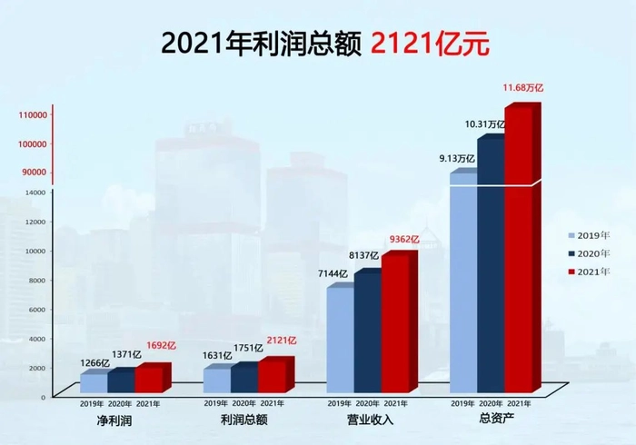 截至2021年末,招商局集团的总资产达11.5万亿元,较2012年翻了五番;营业收入从2012年的647亿元增长至2021年的9292亿元,复合增长率达31%;利润总额、净利润分别从2012年的265亿元、215亿元,增长至2021年的2122亿元、1695亿元,复合增长率均达23%。