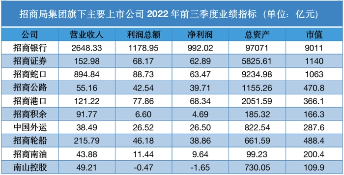 2022年前三季度,招商银行营收2648.33亿元,净利润992.02亿元,总资产达9.7万亿元,市值超过9000亿元,各项指标均位列招商局集团旗下上市子公司之首。
