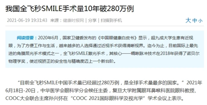 据BT财经了解到,截至2021年,中国全飞秒手术量10年来已破280万例,全国激光手术摘镜人数累计突破700万人。仅在深圳,每年就有近10万人通过飞秒手术摘镜。《健康时报》在2021年还专门对此作过专题报道。