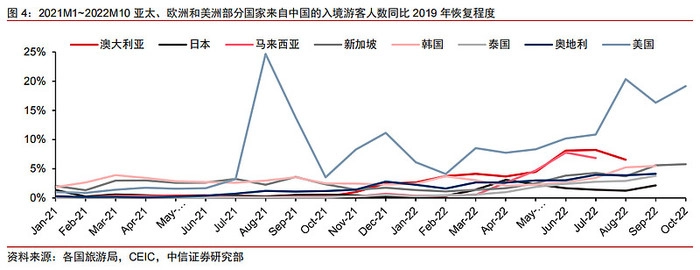 中信证券研究显示,根据各国统计局和旅游局的数据,2022年8月中国游客入境美国、澳大利亚和新加坡的客流,分别恢复至2019 年的 20%、7%、4%。以美国为目的地的中国出境游复苏,明显高于亚洲各国。在此背景下,中国出境的人均机酒花费有明显上涨,就是可以理解的了。