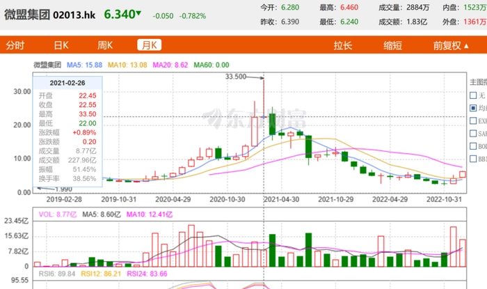 在9个月前的3月29日,微盟股价为5.45港元/每股,现今市值增加22.7亿港元,但距2021年2月26日最高点的33.50港元/每股,却依然有81.1%的下跌,市值蒸发了692.3亿港元。