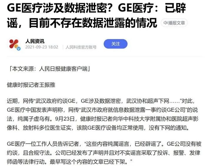 2021年9月被外界质疑“GE医疗信息安全问题”,GE医疗第一时间作出回应,回应称网传“武汉市政府就信息数据泄露一事约谈GE公司”的说法,纯属子虚乌有。GE医疗中国未接到任何来自执法部门或相关监管部门就此事展开的约谈或调查。同时GE医疗中国强调,始终严格遵守中国的法律法规进行商业活动,并遵循业界最严格的安全规范进行数据安全和隐私保护方面的工作,随时配合医院和有关部门工作。