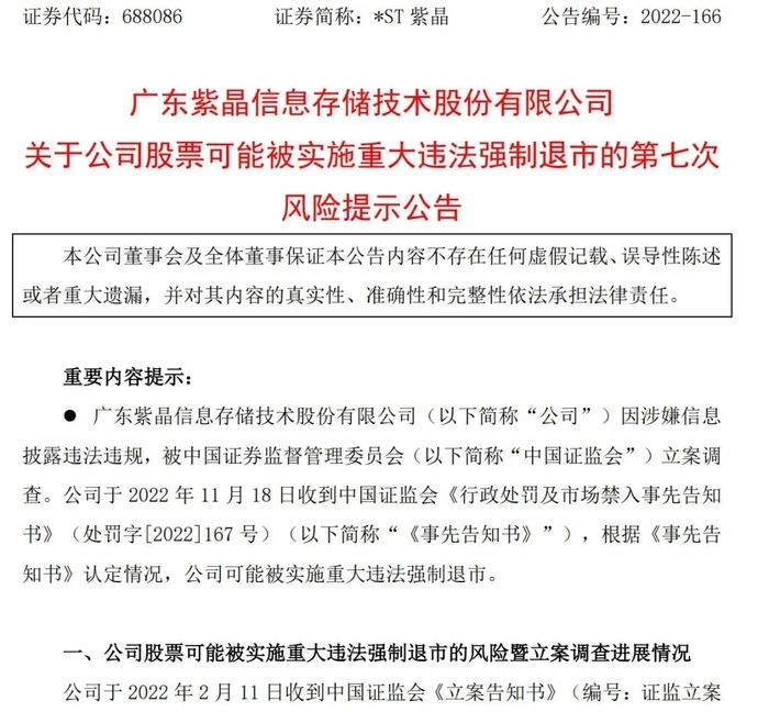 广东紫晶信息存储技术股份有限公司(以下简称紫晶存储)发布公告称,因涉嫌信息披露违法违规,被证监会立案调查,并于 2022年11月18日收到证监会《行政处罚及市场禁入事先告知书》(处罚字[2022]167号),根据《事先告知书》认定情况,紫晶存储可能面临被强制退市的风险。