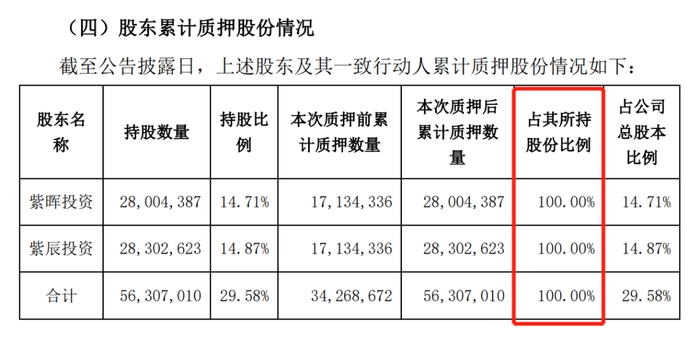 两天后,也就是2022年3月26日,紫晶存储再次发布控股股东质押股份的公告,截至3月26日,紫晖投资和紫辰投资已经质押了所有的股份。