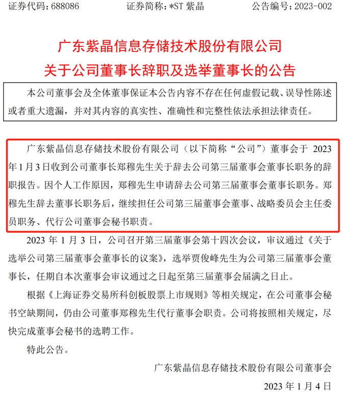 在内忧外患下,紫晶存储董事长郑穆于2023年1月3日宣布辞职,直接撩了挑子。紫晶存储随即发布相关公告进行确认,在上市三年来,股价如今早已经跌破发行价,或创下科创板最快的退市记录。