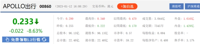 公告发布后,Apollo早盘就高开近14%,但随即股价开始一路跳水,截至12日收盘,股价为0.233港元/每股,跌幅为8.63%。
