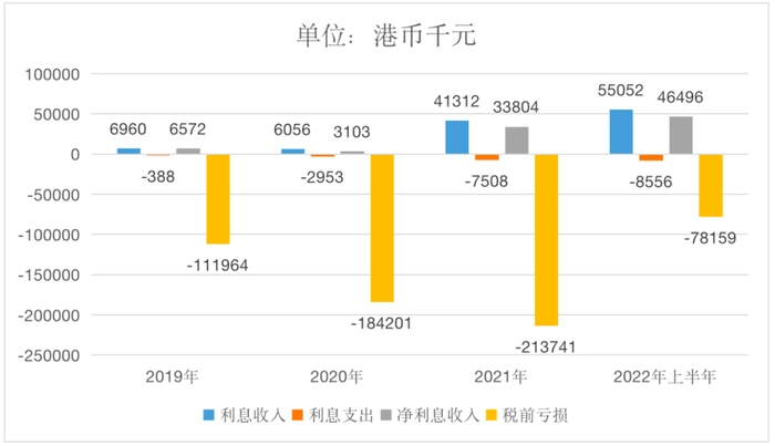 而为此做出最大贡献的依然是利息收入的高速增长。财报显示,截至2022年6月底,利息收入达5505.2万港元,同比增加537.32%,半年收入已经超过了2021年全年。而利息支出为855.6万港元,同比增速382.3%,低于利息收入的增速。