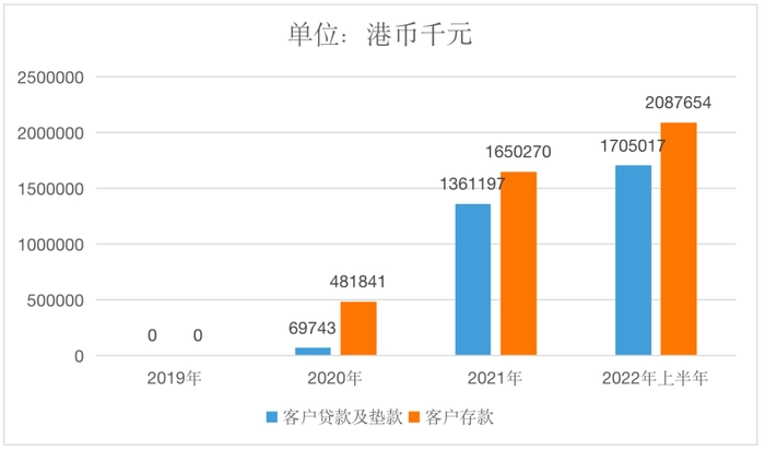 2020年总负债为6.09亿港元,其中客户存款高达4.82亿港元,占总负债的79.15%。存贷业务都实现了零的突破,不过贷存比率仅为14.47%,尚不平衡。