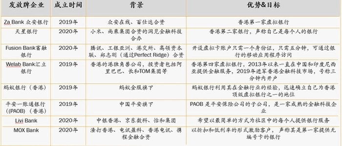 2019年,香港金管局陆续发出了八张虚拟银行牌照,分别为众安银行、天星银行、富融银行、汇立银行、蚂蚁银行、平安壹账通银行、Livi Bank、MOX Bank。