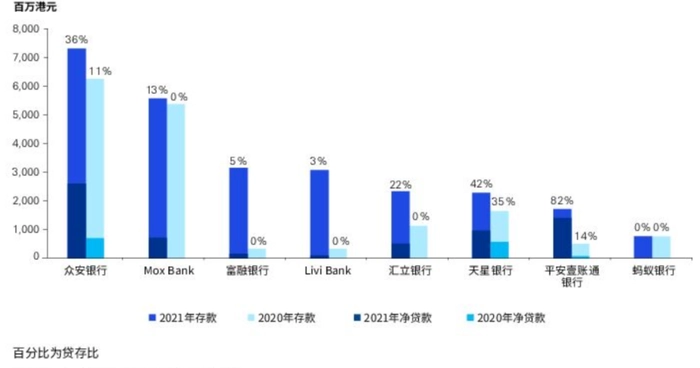 《报告》显示,八家虚拟银行发放的净贷款金额从2020年12月10亿港元增长至2021年12月的60亿港元,但整体贷款规模相比于实现盈利所需的水平仍然过小,2021年平均贷存比仅为25%,与所有认可机构的平均贷存比86.7%相差甚远。不过,这也与个别银行业务未发力信贷业务有关,从而拉低了整体的贷存比率。