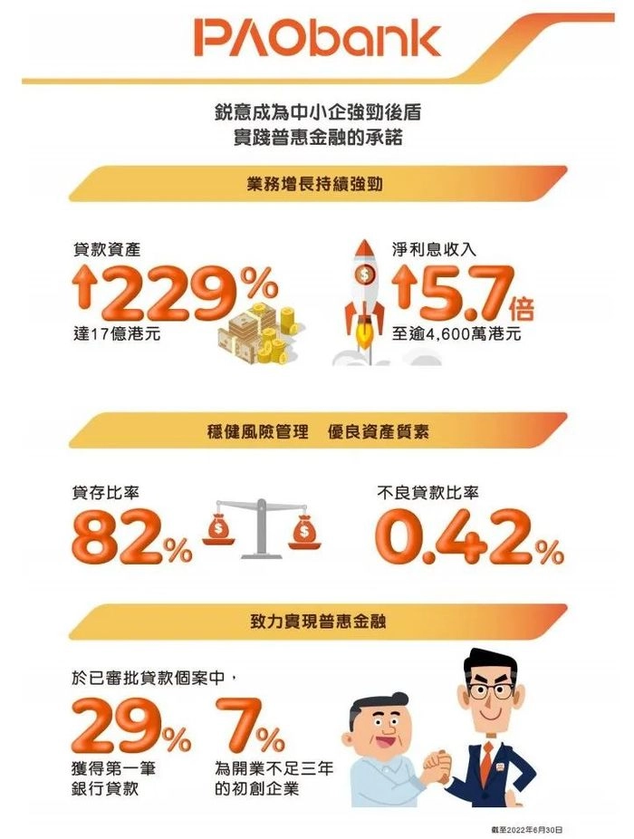 截至2022年6月30日,在已审批贷款的客户中,29%为首次获得银行贷款。而在曾获其他银行贷款的客户中,77%为首次获银行批出无抵押贷款。此外,该行已审批贷款的客户中有7%为开业不足三年的初创企业。