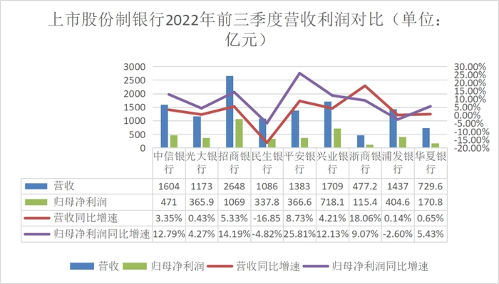 2022年前三季度,九家上市股份制银行合计实现营业收入1.22万亿元,同比增长仅为1.92%,该增速较2021年的年增速5.34%有所下滑。