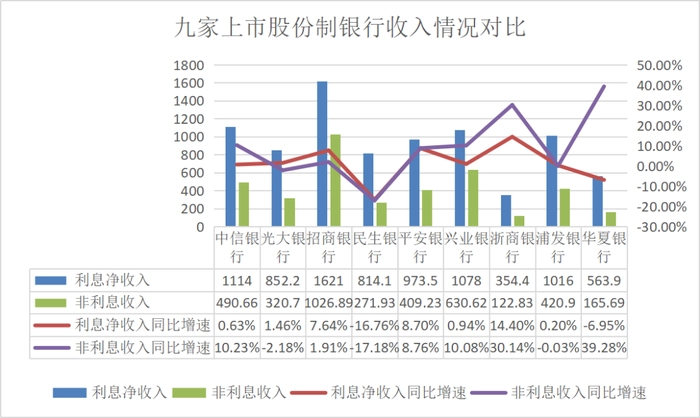 从收入类型来看,九家上市股份制银行的利息净收入合计达到8387.1亿元,同比增长仅为0.75%。其中,招商银行利息净收入最高,达到1621亿元,同比增速7.64%,排名第三。只有四家银行的利息净收入突破了一千亿元。同比增速最高的为浙商银行,达14.4%。