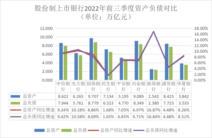 2022年前三季度,上市股份制银行的资产和负债规模都在平稳增长中。财报显示,九家上市股份制银行的资产规模合计达到60.82万亿元,同比增长7.36%,较2021全年7.88%的增速下降了0.52个百分点。