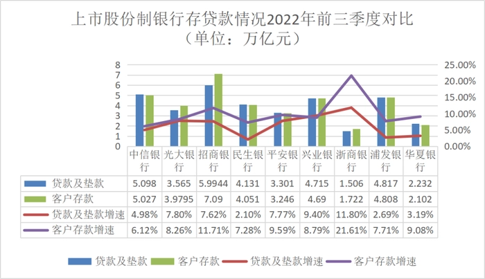 负债端方面,客户存款仍是股份制商业银行负债的主要来源。截至2022年9月,九家上市银行的客户存款余额合计36.72万亿元,同比增长7.11%。浙商银行因体量最小,增长空间较大,增速最快,达21.61%。招商银行无愧于“零售之王”的称号,综合表现最为出色,是唯一一家客户存款金额突破7万亿元大关的股份制银行,而且增速达到11.71%,仅次于浙商银行,保持着高位优势。