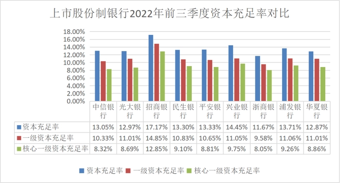 根据《商业银行资本管理办法(试行)》,我国商业银行资本充足率不得低于10.5%,一级资本充足率不得低于8.5%,核心一级资本充足率不得低于7.5%。虽然九家上市股份制银行均已达到了这个标准要求,但是2022年前三季度上市股份制银行的资本充足率,相较于2021年底出现了普遍下降,无一例外。