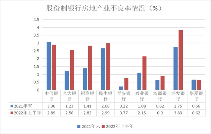 2022年上半年,在房地产业务规模占比均有所下降的情况下,除了中信银行和华夏银行之外,其余七家银行房地产业的不良率都较2021年末出现了增长。其中招商银行增幅最大,提高了1.41个百分点,光大银行紧随其后,提高了1.33个百分点,浦发银行和兴业银行也都提高了1个百分点以上。