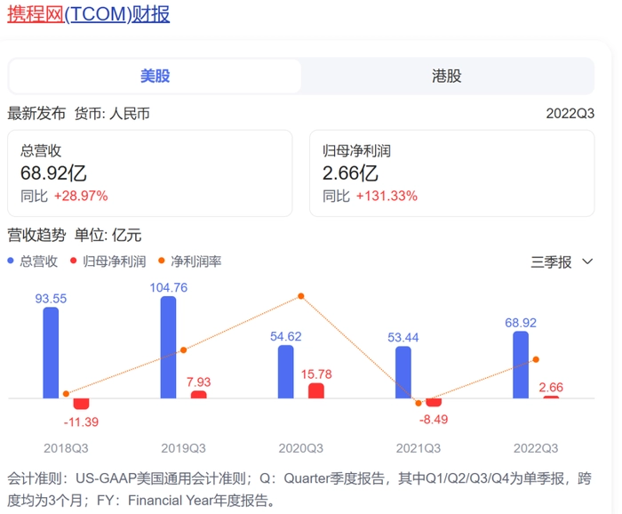 携程、同程艺龙和途牛是中国上市的三家在线旅游公司,在公布的三季报中表现不尽相同。财报显示,第三季度携程总营收为69亿元,同比增长29%,净利润为2.45亿元,经调整为14亿元,同比增长164%。