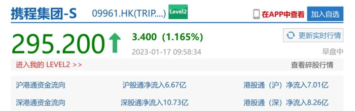 而港股上携程的表现同样出色,2022年10月31日,港股股价为173.2港元/股,截至2023年1月17日收盘,携程股价为295.2港元/股,在三季报发布后,携程港股股价同样上涨了59%。港股总市值约1892亿港元。