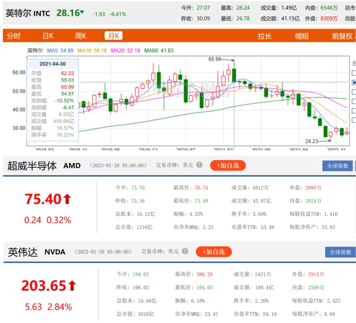 财报发布后,英特尔在1月27日盘中暴跌10.9%,收盘跌幅收窄至6.4%,其竞争对手AMD和英伟达分别上涨0.32%和2.84%。截至1月28日收盘,英特尔股价跌至28.16美元/股,再次下跌6.41%。较2021年4月高位的65.99美元/股,已经跌去57.3%,市值蒸发近1200亿美元。