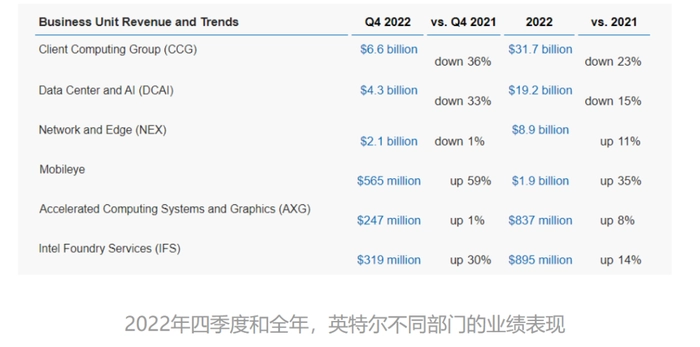 2022年四季度财报显示,英特尔140.42亿美元的季度营收,较2021年同期的205.3亿美元下跌32%;净亏损为6.61亿美元,而2021年同期的净利润则为46.23亿美元。从具体表现来看,作为英特尔最大的“现金奶牛”部门英特尔客户运算事业群,在第四季度净营收仅为66.25亿美元,2021年同期则为103.33亿美元,同比下降36%,全年营收为317亿美元,较上年同期下跌23%。