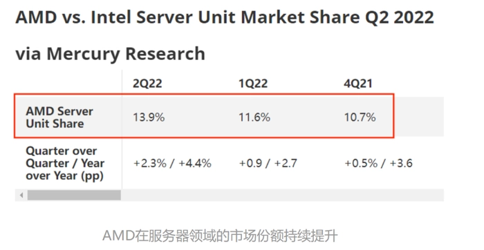 第三方机构数据显示,由于英特尔第四代至强处理器多次延迟推出,AMD这两年几乎每个季度都会在服务器市场取得增长,整体份额目前已达到两位数。此消彼长,英特尔的市场份额不断下滑,而竞争对手在不断上涨,这也是分析师表示震惊的原因所在。