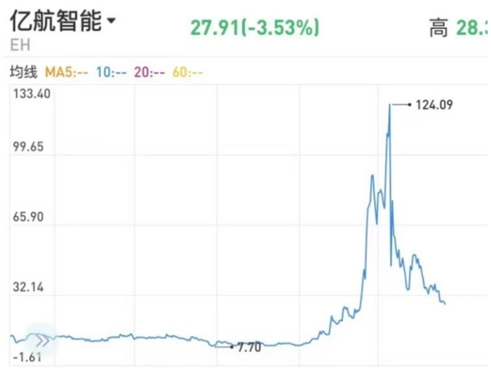 亿航智能在2019年美股上市以后,股价飙升,2019年12月至2021年2月15日,在14个月的时间内,股价从14美元飙升至124美元,累计涨幅高达750%,在中概股里出尽了风头。