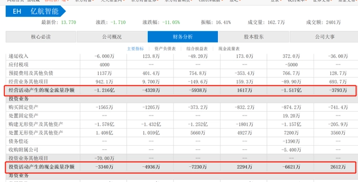 做空机构强调的是,亿航智能的收入来源单一。亿航智能的营收主要靠销售可载人AAV。商业模式单一造成的后果就是,在研发费用持续增加的情况下,没有多元渠道的资金流入,导致持续烧钱,持续亏损。如下图所示,亿航智能因经营活动产生的现金流净额在6个报告期内只有一次为正1617万元,而其他时期动辄负1亿元以上,同时投资活动产生的现金流净额,基本类似,基本以负值为主,这或许也是做空机构不看好亿航智能的原因所在。