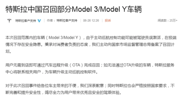 不过不同于传统意义上的召回,特斯拉最近的这次召回是通过软件在线升级(OTA)的形式进行,即不需要将车辆送到特斯拉的售后服务处,远程联网进行软件升级就可以修复车辆缺陷。但此次的召回事件还是让消费者对特斯拉产生了不信任。