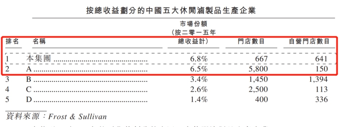 “2015年,按收益计,周黑鸭是中国最大的休闲卤制品公司,约占中国休闲卤制品公司总收益的6.8%;按零售价值计,周黑鸭是第二大休闲卤制品公司,约占中国休闲卤制品公司零售总值的5.7%;以网上渠道收益计,周黑鸭的市场份额最大。”