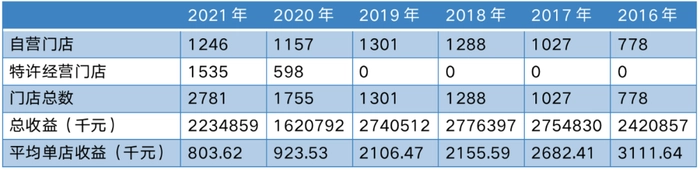 BT财经统计了周黑鸭2016-2021年的门店情况,发现周黑鸭在2019年前一直坚持自营门店模式,但是平均单店收益却呈逐年下滑状态。2019年的门店数量达到1301家,较2015年几乎翻了一番,但平均单店收益却从2015年的319.55万元减少至210.65万元。店越开越多,却越来越不挣钱,这意味着周黑鸭之前引以为豪的高端化路线出现了严重问题。