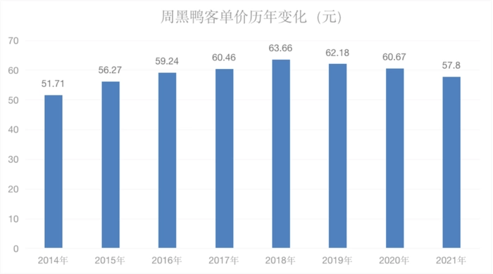而周黑鸭呢?一开始就被高端化架在了高处。高客单价虽然为周黑鸭带来过高利润,但是也断绝了周黑鸭通过涨价来提升业绩的更多可能。事实上,2018年之后,周黑鸭的客单价就开始逐年下滑,2021年已降至57.8元,2022年上半年又略有回升,至59.13元。总体来看,周黑鸭的客单价很难再进一步提升。