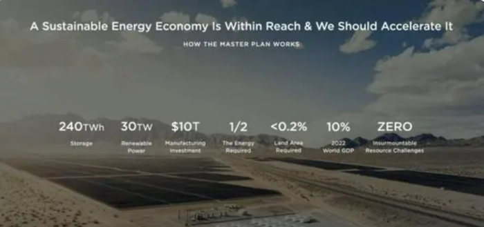 具体到如何实现这一目标,马斯克给出的前提条件是:储能240TWh、可再生电力30TW、制造投资10万亿美元、需要能源不到燃料经济的一半、占地面积低于0.2%、占2022年全球GDP的10%、无法克服的资源挑战为零。这么看来,这些条件中的任何一项短期内都几乎无法实现,尤其是10万亿美元的投资构想,更是让投资者无语之至。