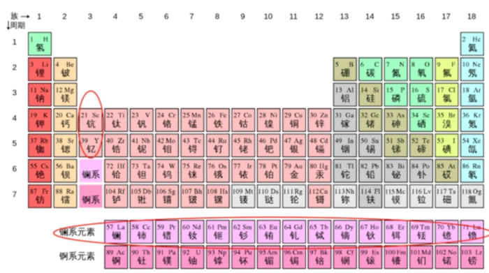 但马斯克可能对稀土本身并不太了解,在元素周期表上,“稀土元素”是下图中用红色标出的元素——镧系元素,加上钪和钇。虽然被称为“稀土”,但稀土元素实际上也并非稀缺,地球上钕的含量大约是铜的三分之二。