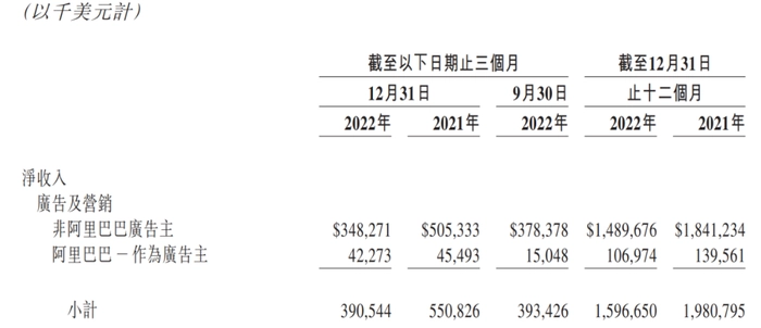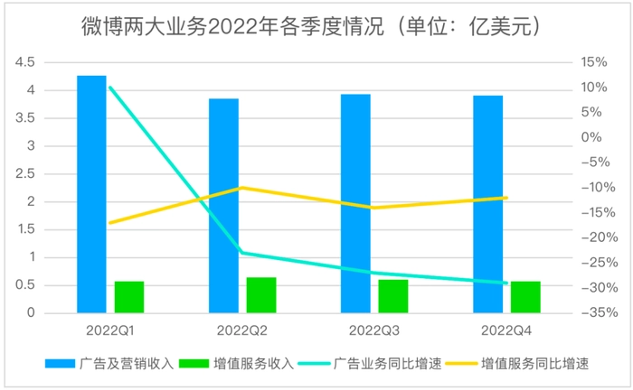 全年来看,2022年微博广告及营销收入为16.0亿美元,同比下降19%;增值服务收入为2.397亿美元,同比下降13%。
