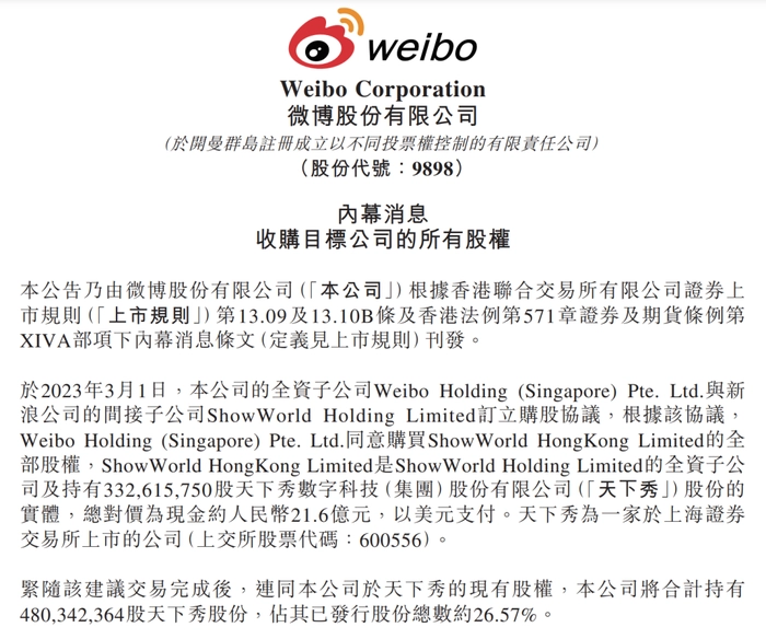 3月1日,微博发布公告称,公司斥资21.6亿元增持天下秀,交易完成后,总计持有后者26.57%的股权。