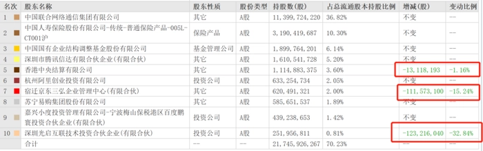 目前中国联通前十大股东持有68.37%的股份,但前十大股东中近期有三家减持。分别为香港中央结算公司和宿迁京东三弘企业管理中心(有限合伙)以及深圳光启互联技术投资合伙企业(有限合伙),这三家公司分别减持自身股份的1.1%、15.24%和32.84%。
