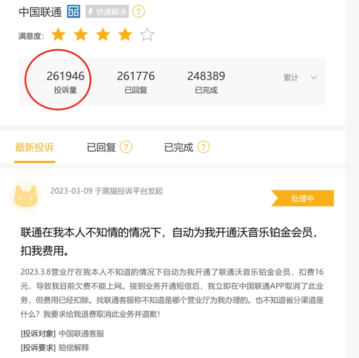 黑猫投诉上,关于中国联通的投诉超过26万件。而同期中国电信的投诉量只有8万件左右,不到中国联通投诉量的1/3。中国移动作为中国第一大电信运营商用户群体规模远远超过其他两家,中国移动用户总数为9.8亿,中国联通总用户为8.7亿,用户总量上有1.1亿的差距,总投诉量中国移动和中国联通差别不大。也就是说中国联通的用户申诉量比例最高。
